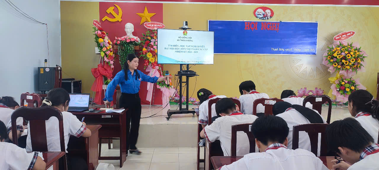 NGÀY 27/3/2025 Tại Hội trường UBND xã Thạnh Hưng tổ chức cho thiếu nhi tìm hiểu, học tập Nghị quyết Đại hội Hội LHTN Việt Nam các cấp nhiệm kỳ 2024-2029 có 90 em thiếu nhi tham gia.